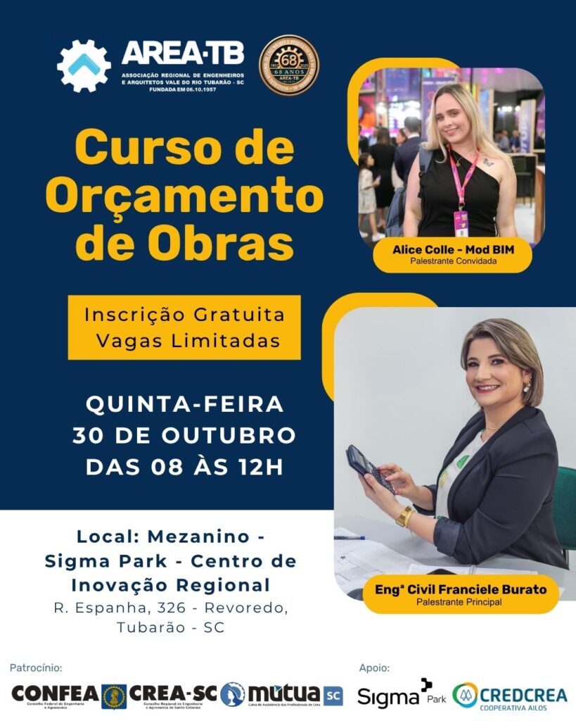No dia 30 de outubro, a AREA-TB realiza o Curso de Orçamento de Obras, com a Engª Civil Franciele Burato, especialista em custos e planejamento, e Alice Colle (Mod BIM), trazendo uma abordagem prática e atual sobre integração entre orçamentação e modelagem BIM.