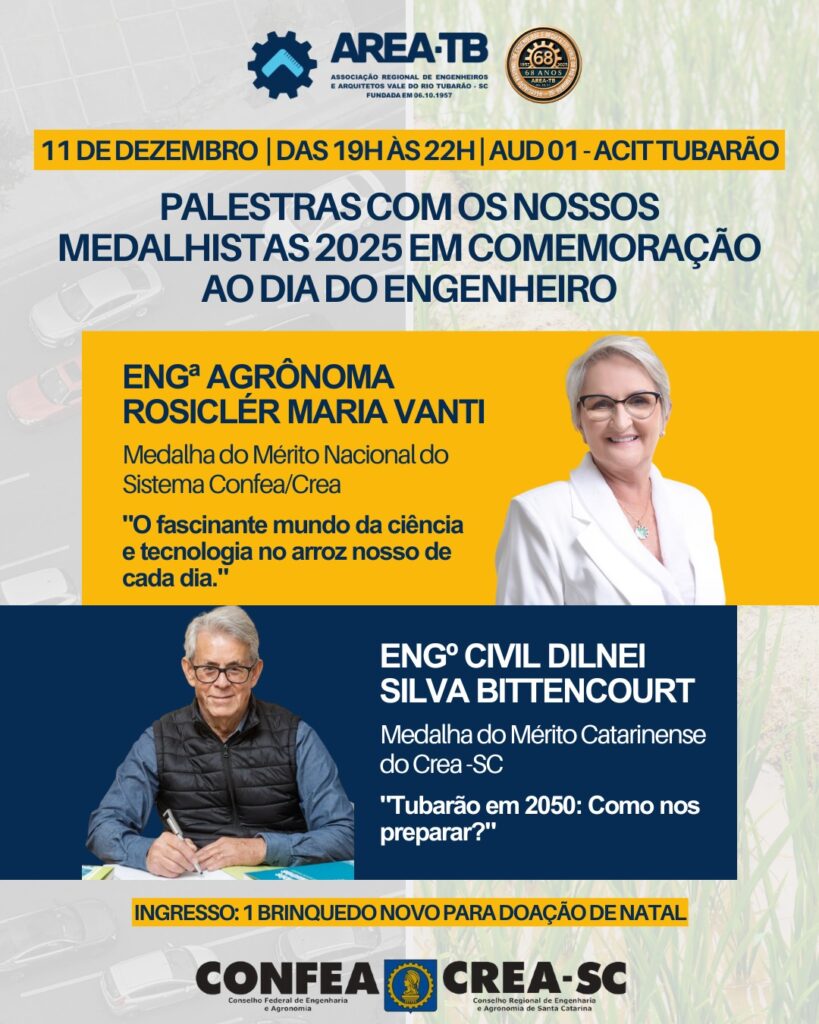 No dia 11 de dezembro, comemoramos o “Dia do Engenheiro”. Faremos um evento único, reunindo nossos dois Medalhistas 2025 do Sistema Confea/Crea.